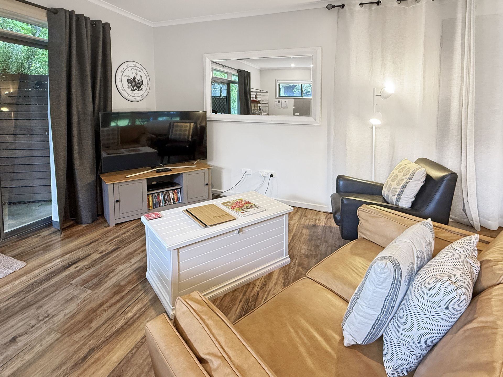 • Bright living area with lounge suite, Smart TV, DVD player + DVD selection