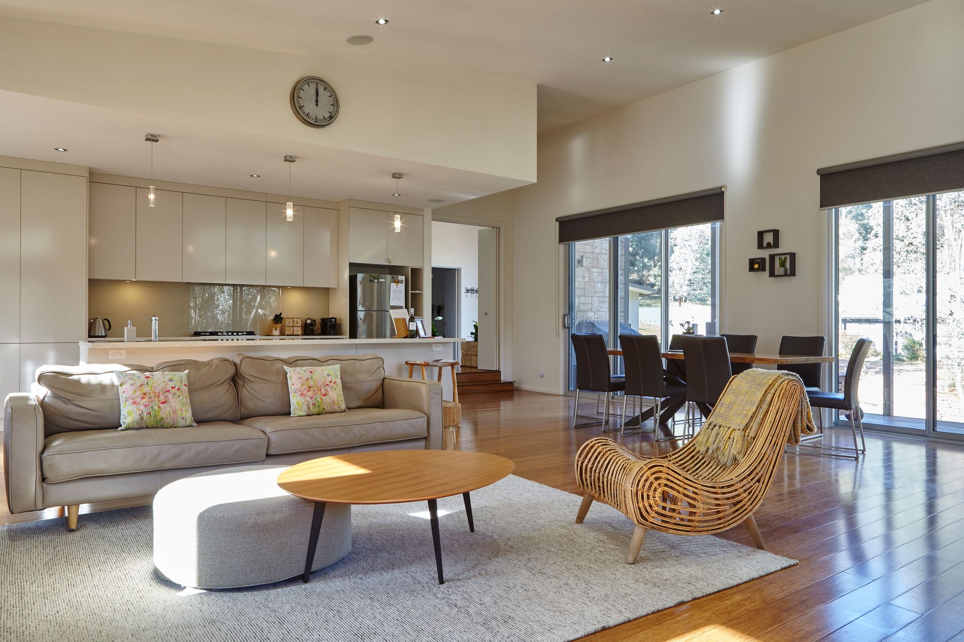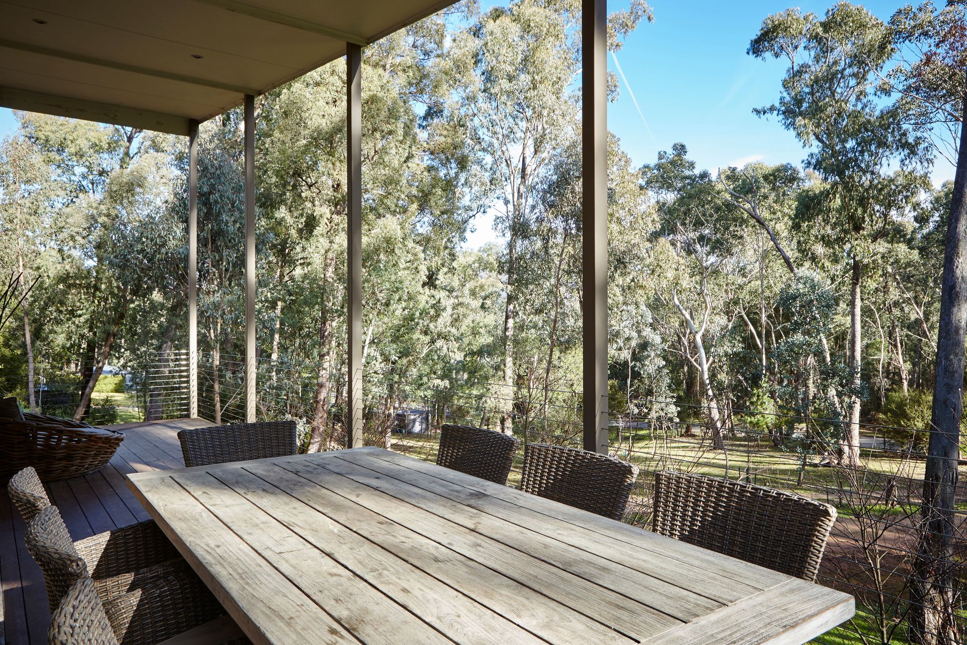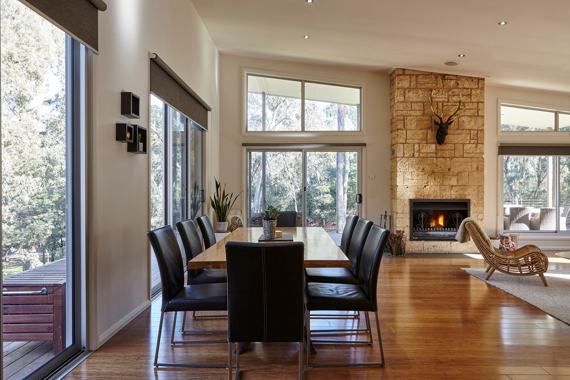 The adjoining gourmet kitchen is fully equipped with stone benchtops and stainless-steel European appliances. Sliding doors open onto a wrap-around deck with an outdoor dining setting for 8 – the perfect spot for alfresco meals, sunset drinks, and wildlife watching.