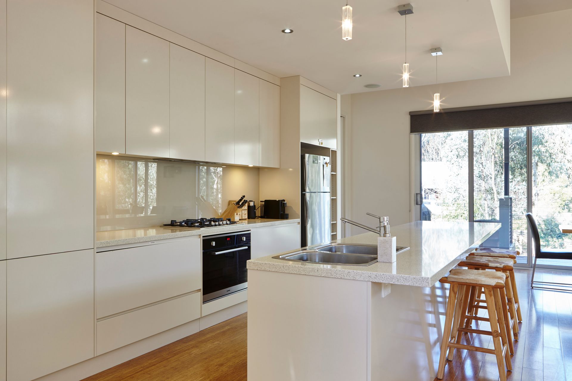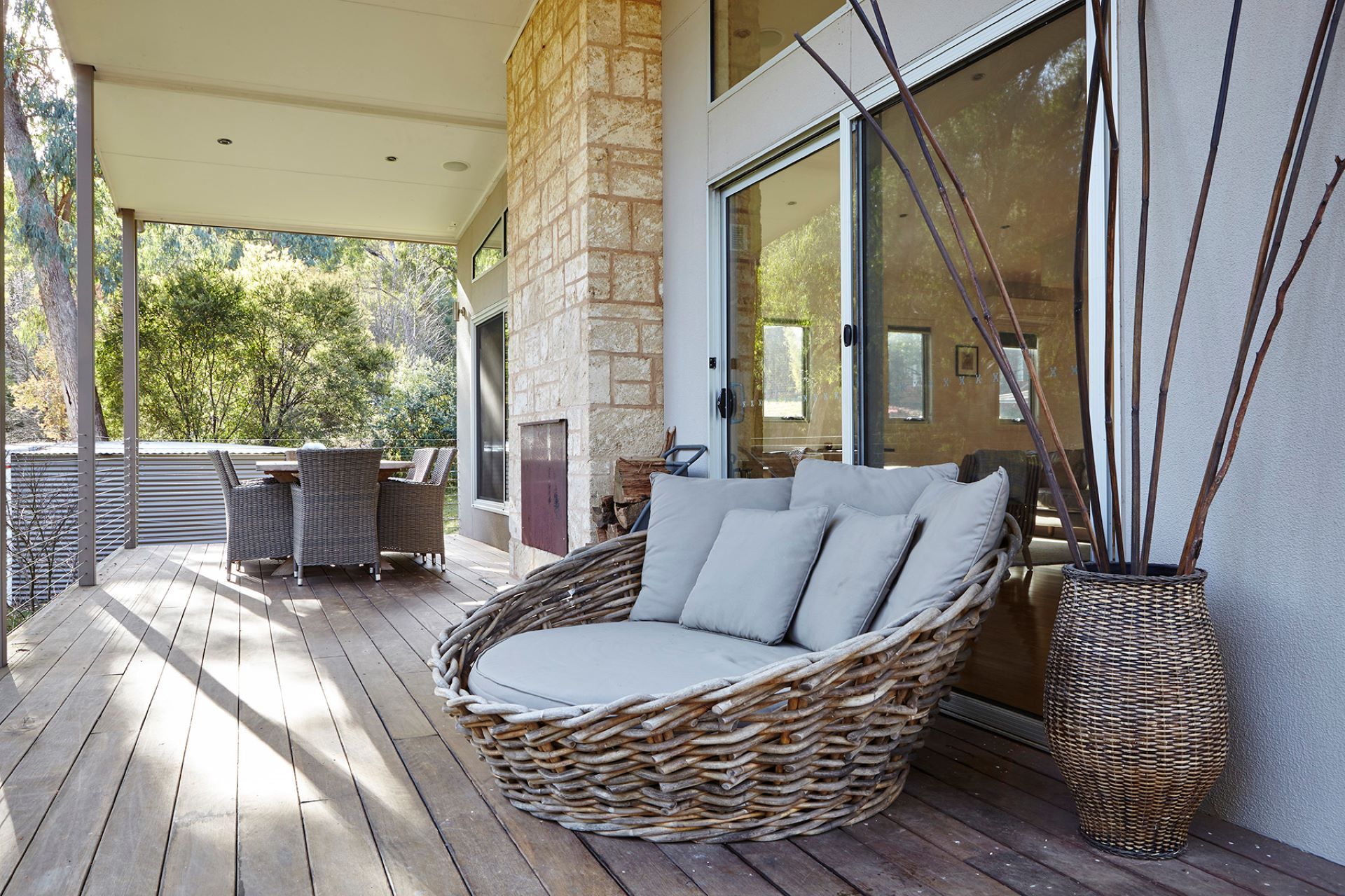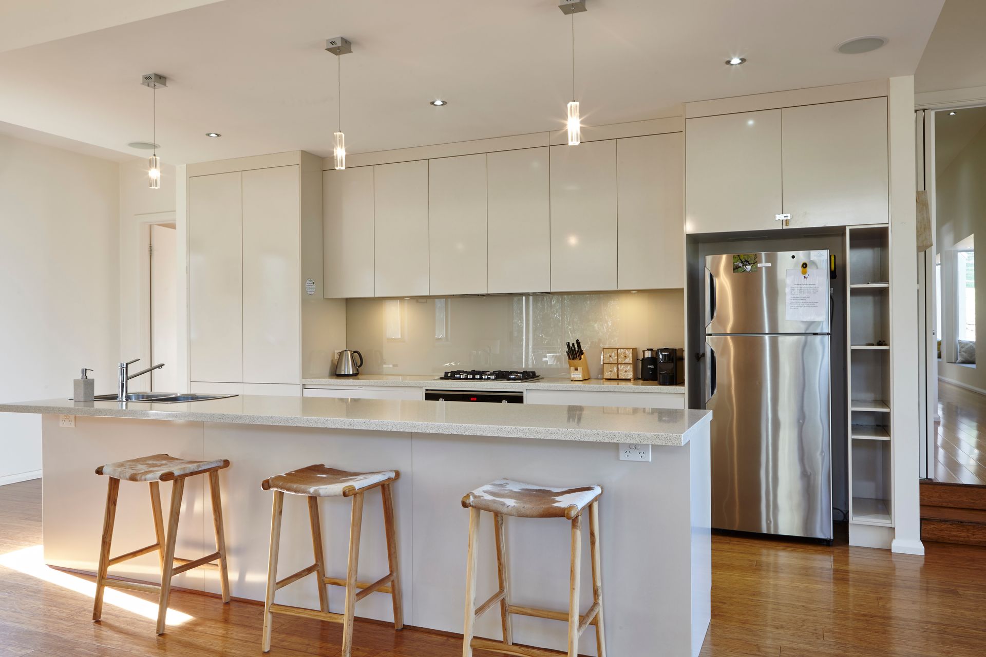 The adjoining gourmet kitchen is fully equipped with stone benchtops and stainless-steel European appliances. Sliding doors open onto a wrap-around deck with an outdoor dining setting for 8 – the perfect spot for alfresco meals, sunset drinks, and wildlife watching.